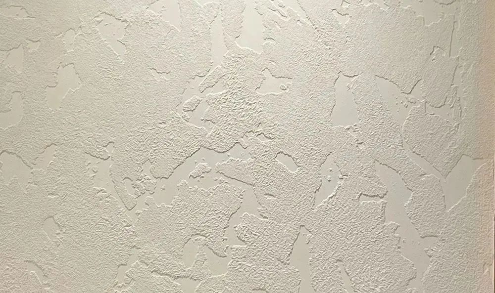 使用氣泵駁接噴槍,將涂料打到墻上,隨機形成點狀效果,再用抹刀收壓一下,將球狀點壓為片狀。最終形成效果就是噴涂、彈涂,如下所示。