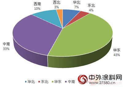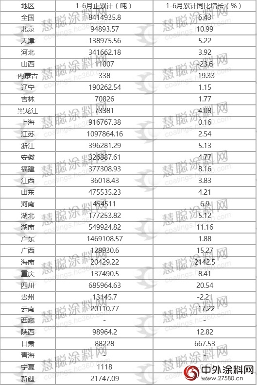 值得一提的是,增幅最大的地區是西北地區和中南地區,此與甘肅與海南的增幅相對較大有關。根據數據,2016年1-6月,海南省涂料產量達到2.04萬噸,增長幅度為2142.50%;甘肅省涂料產量為8.82萬噸,增長幅度為667.53%。