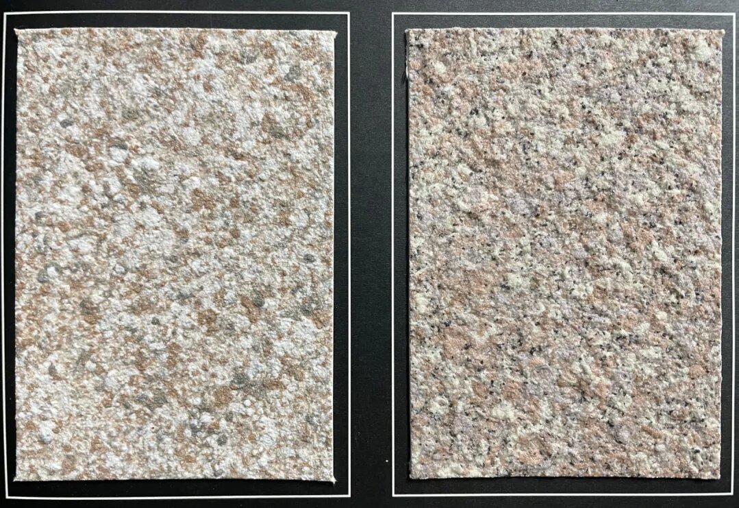 在墻體施工水泥砂漿時(shí),預(yù)先測量規(guī)劃,填埋鋁合金線條或塑膠條,批平水泥砂漿層跟線條一樣高,完成后形成深槽效果。后續(xù)施工花崗巖漆無需再進(jìn)行分割線施工。