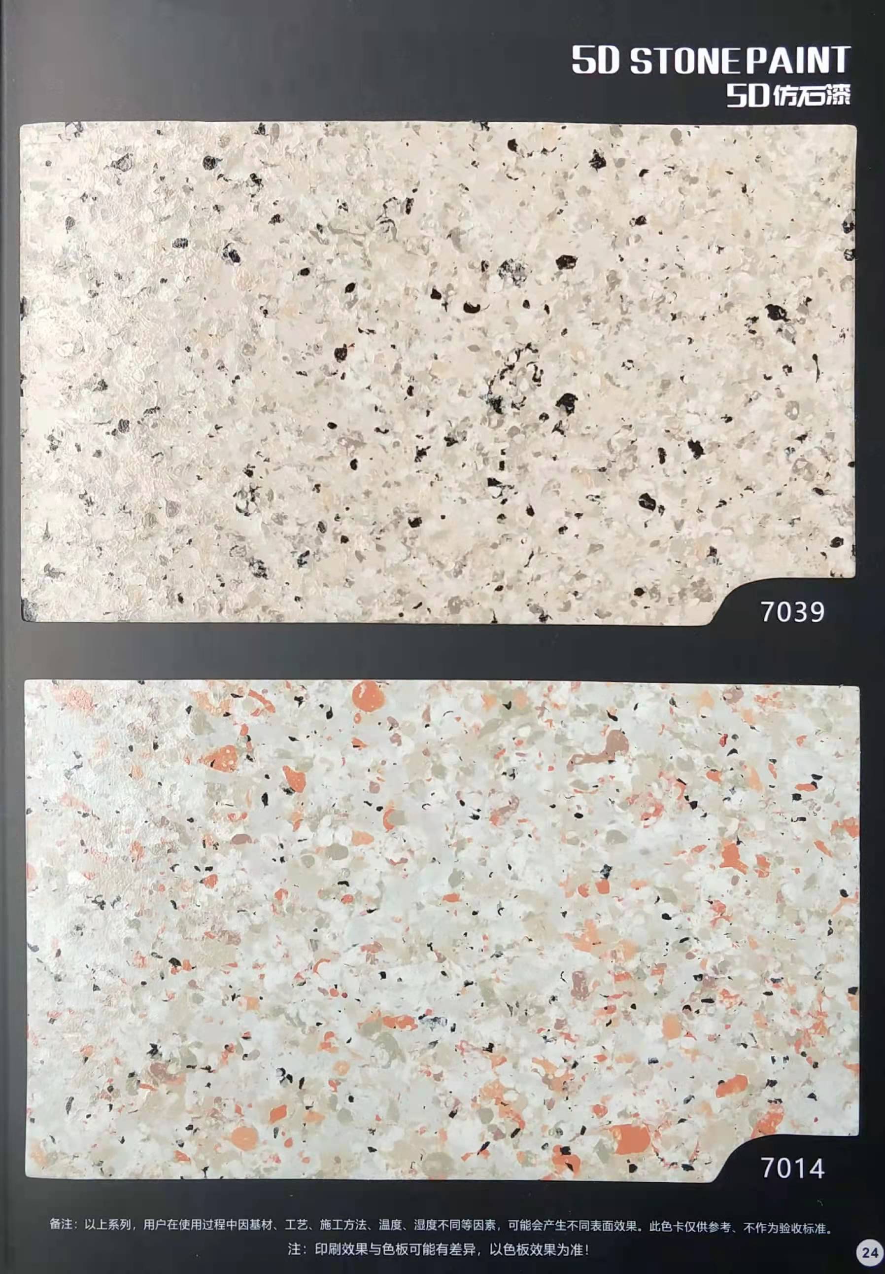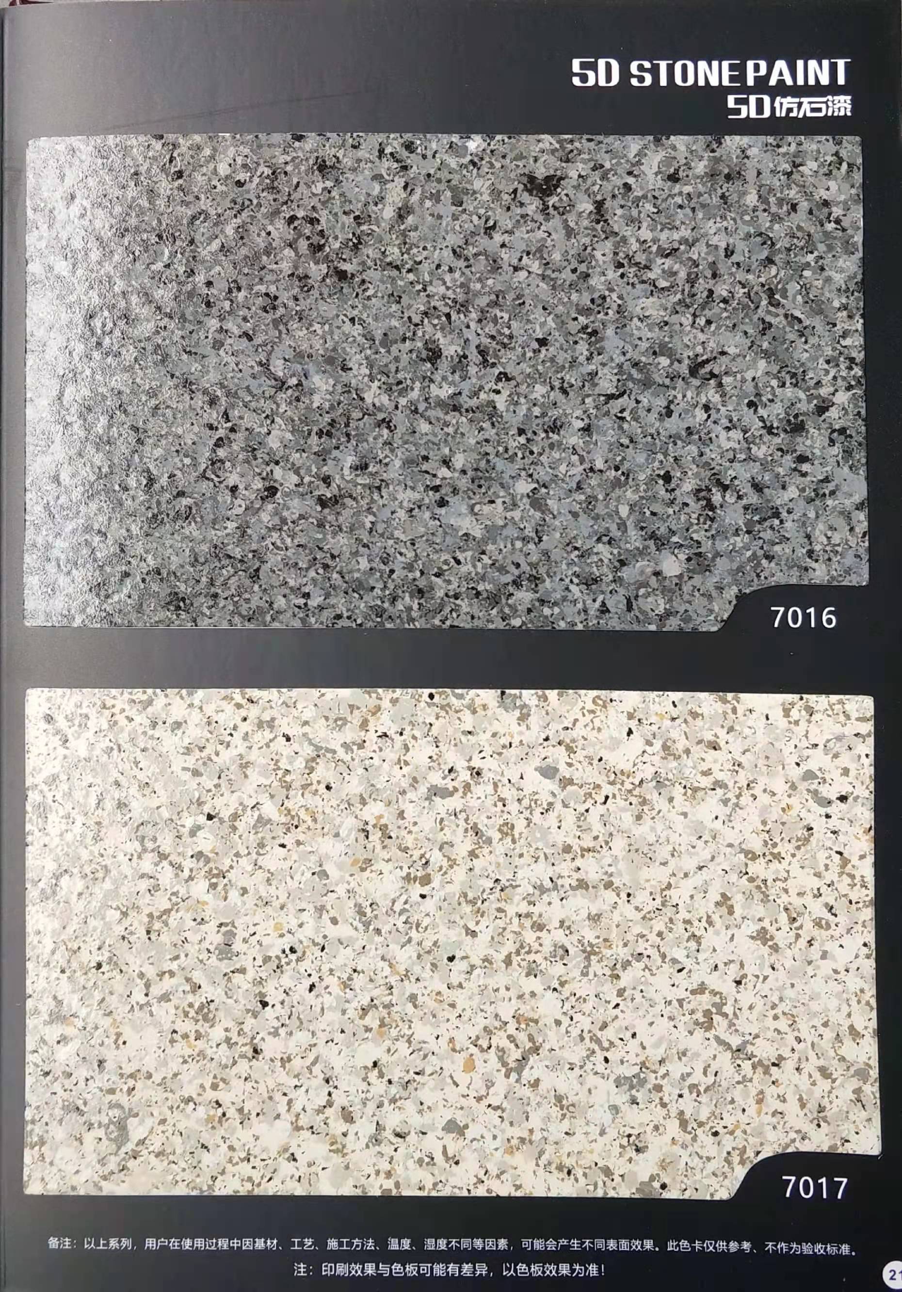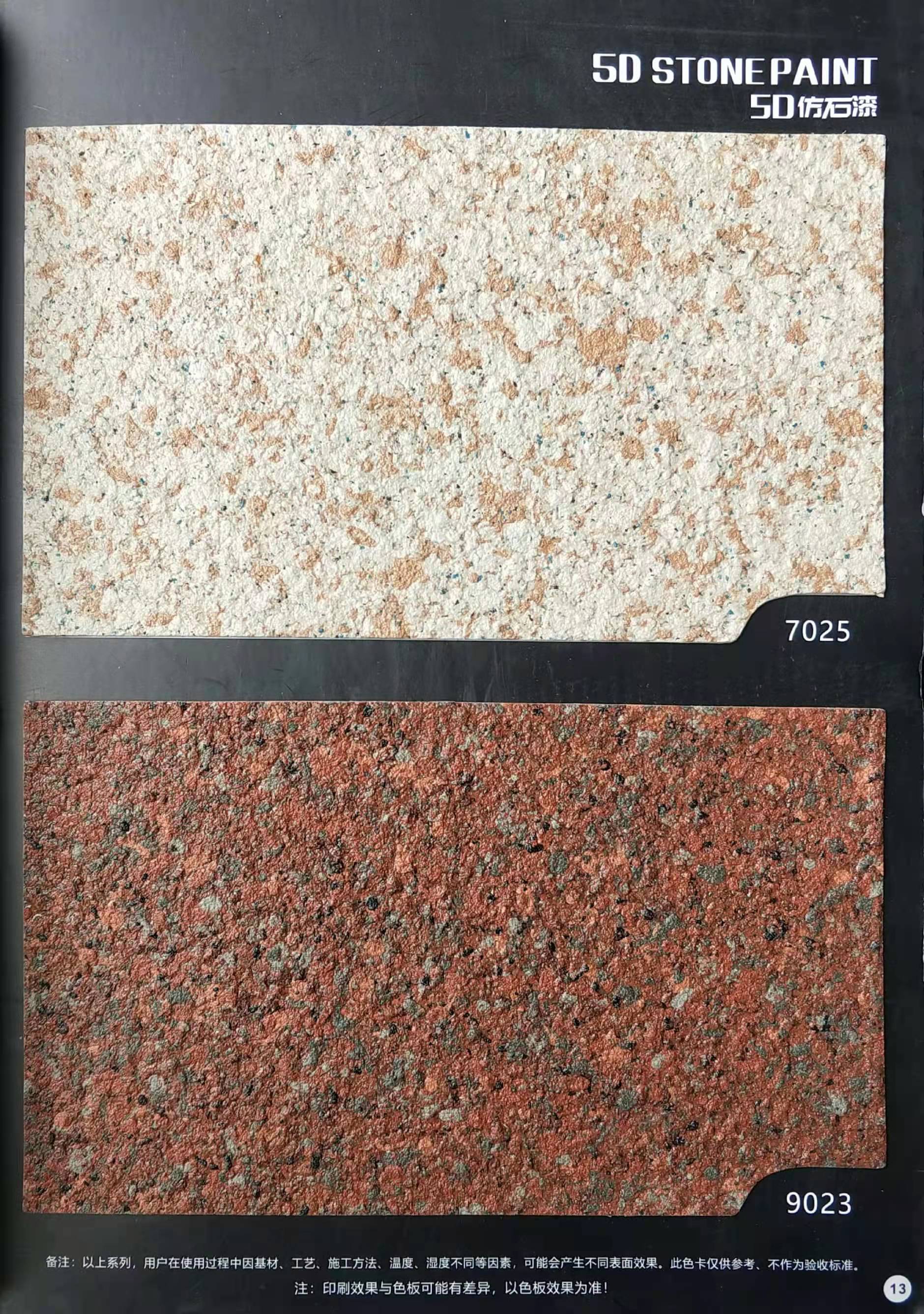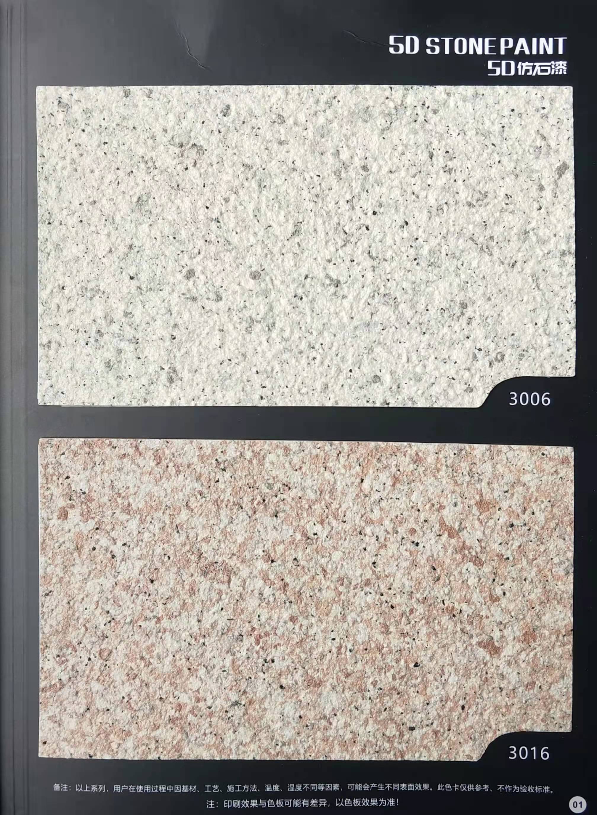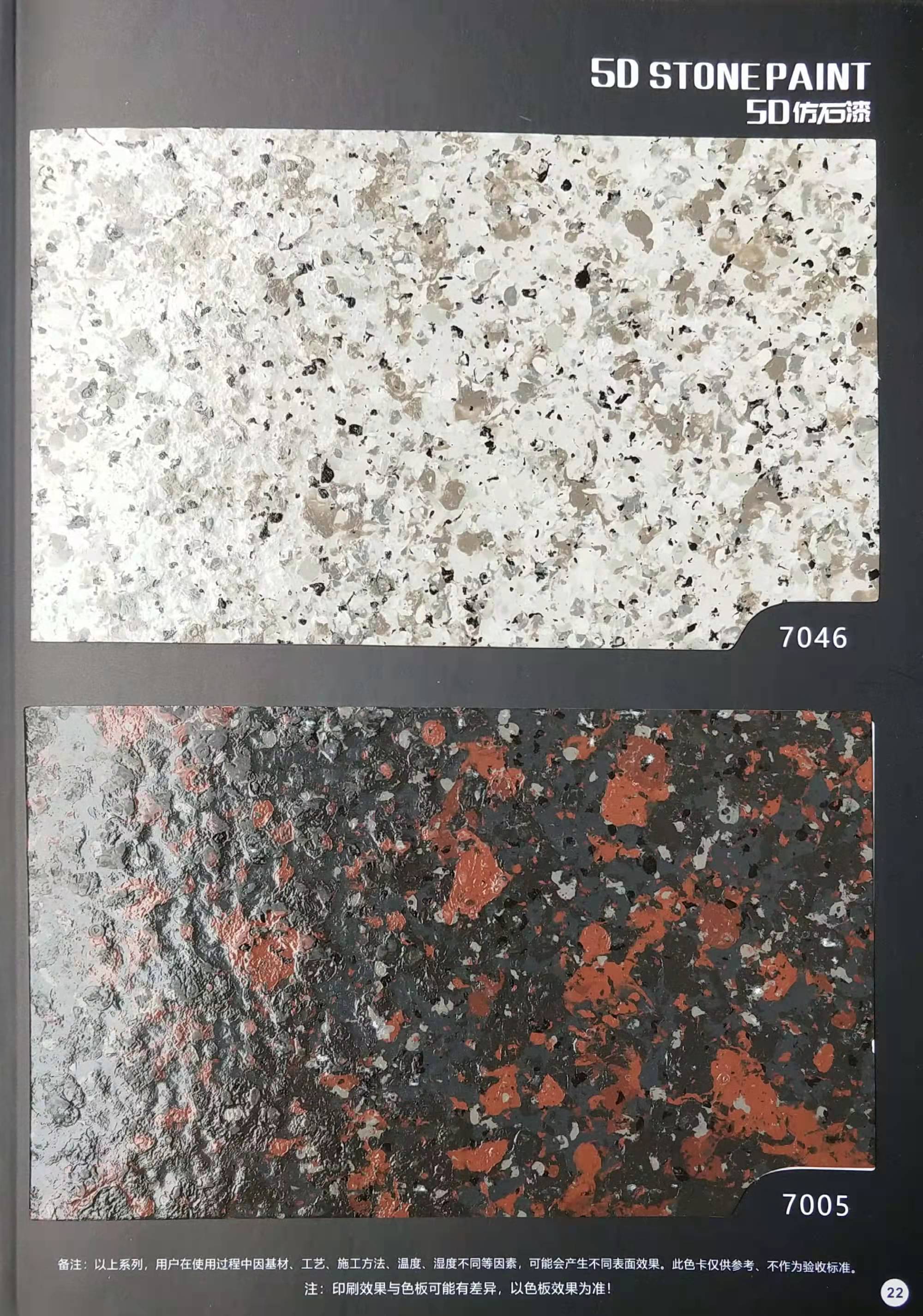 為方便市場(chǎng)客戶對(duì)5D仿石漆樣式的選擇,滿足消費(fèi)者對(duì)其產(chǎn)品效果的體現(xiàn),友情漆現(xiàn)在推出一套全方景立體式展現(xiàn),用不同色彩仿石漆組合裝飾出來(lái)的墻面效果圖冊(cè)。