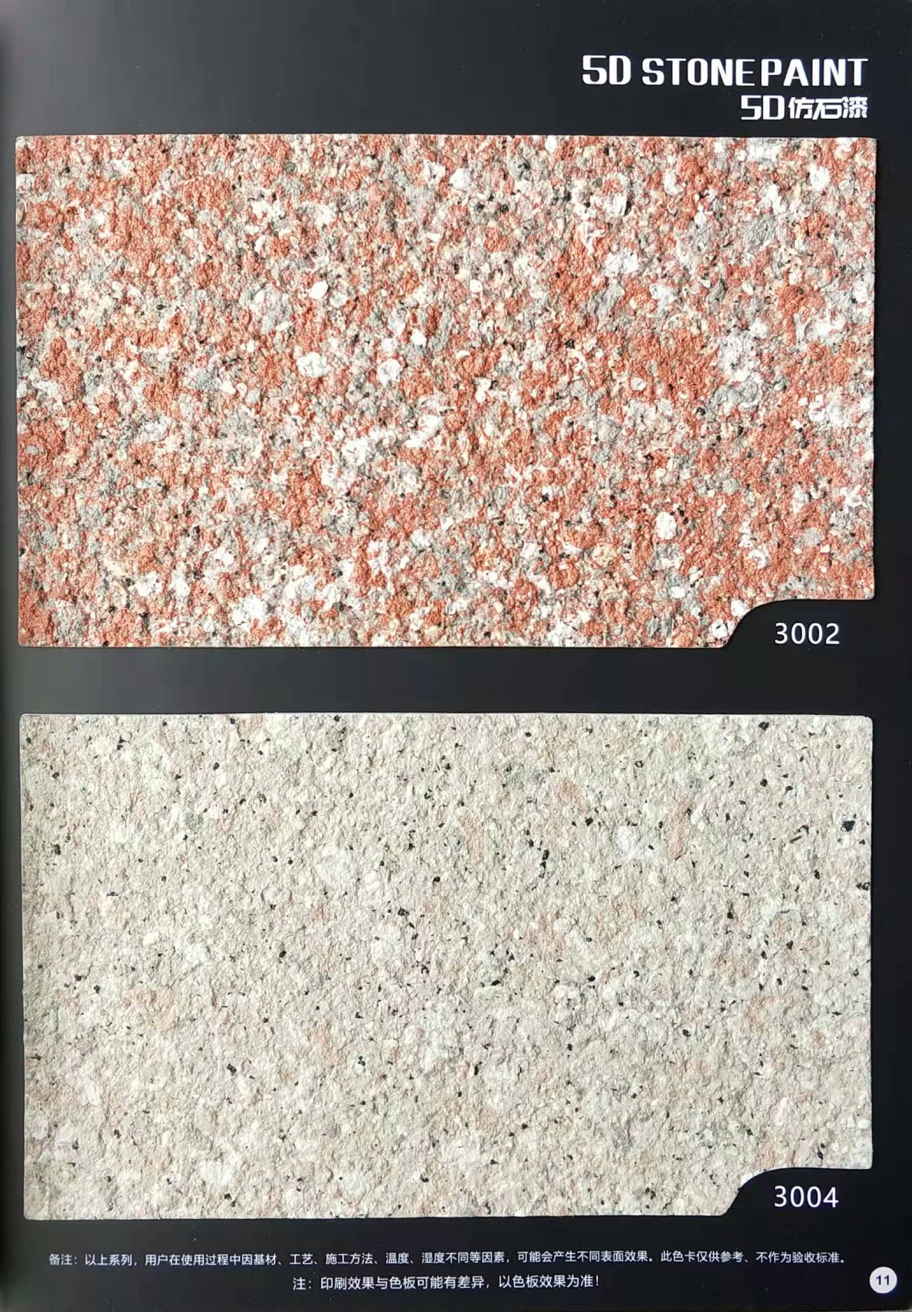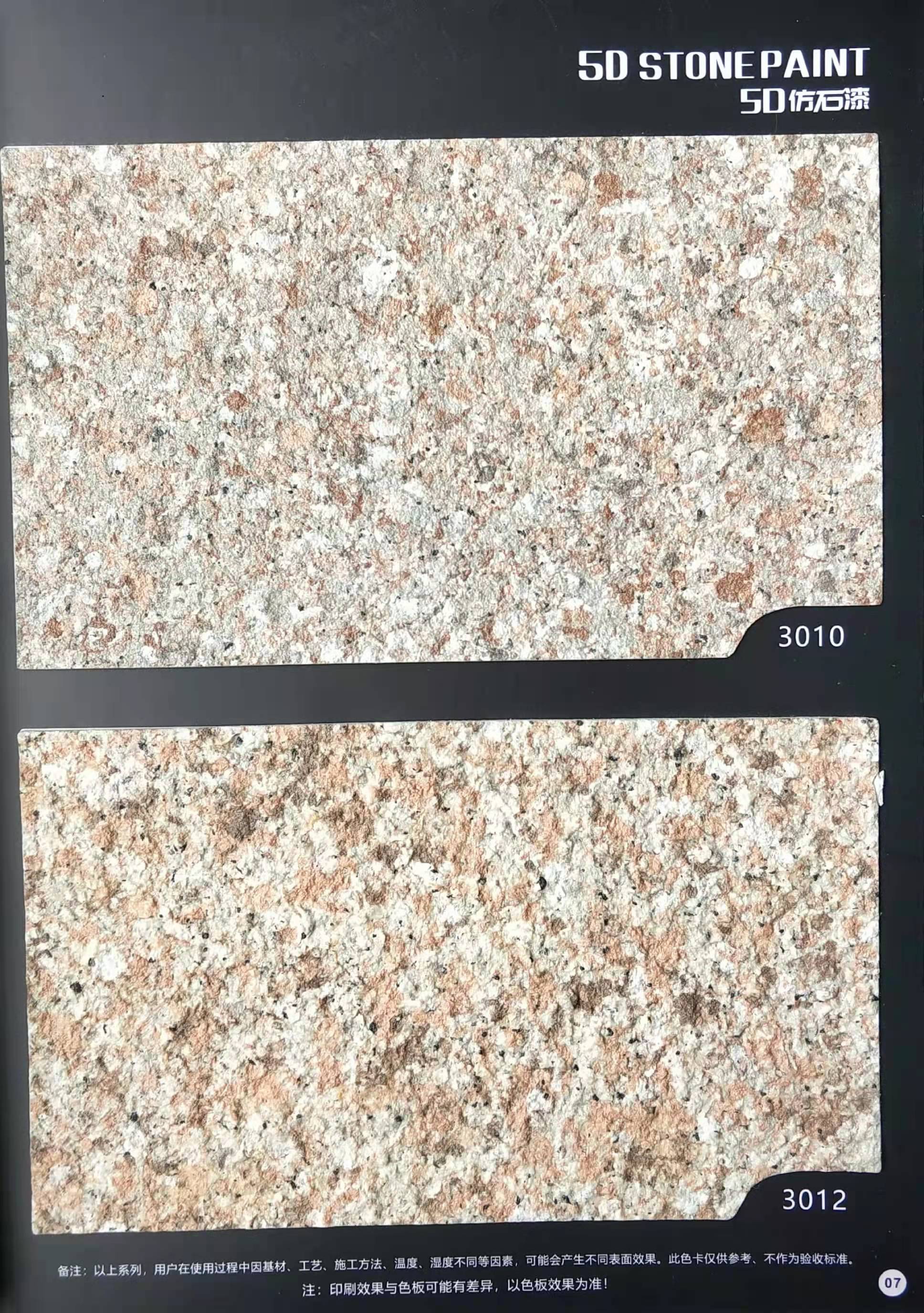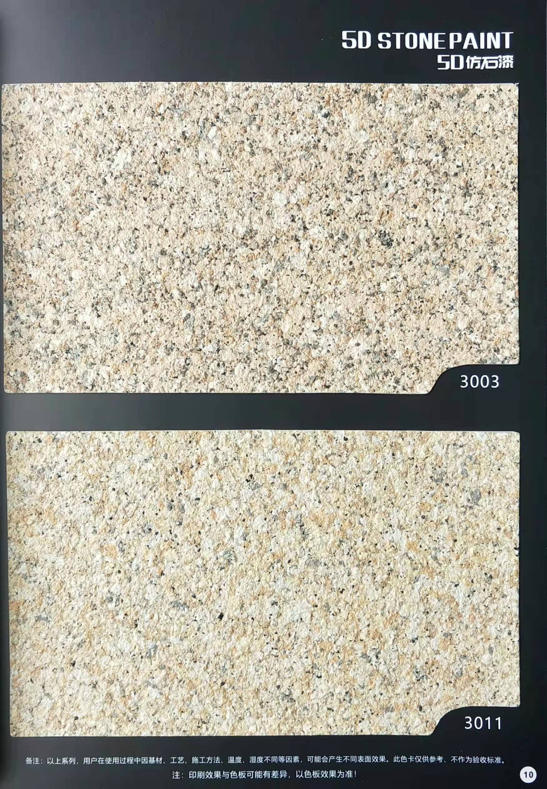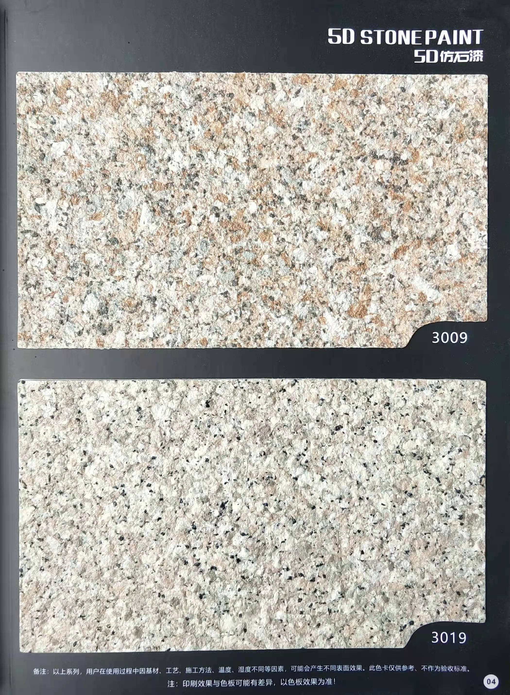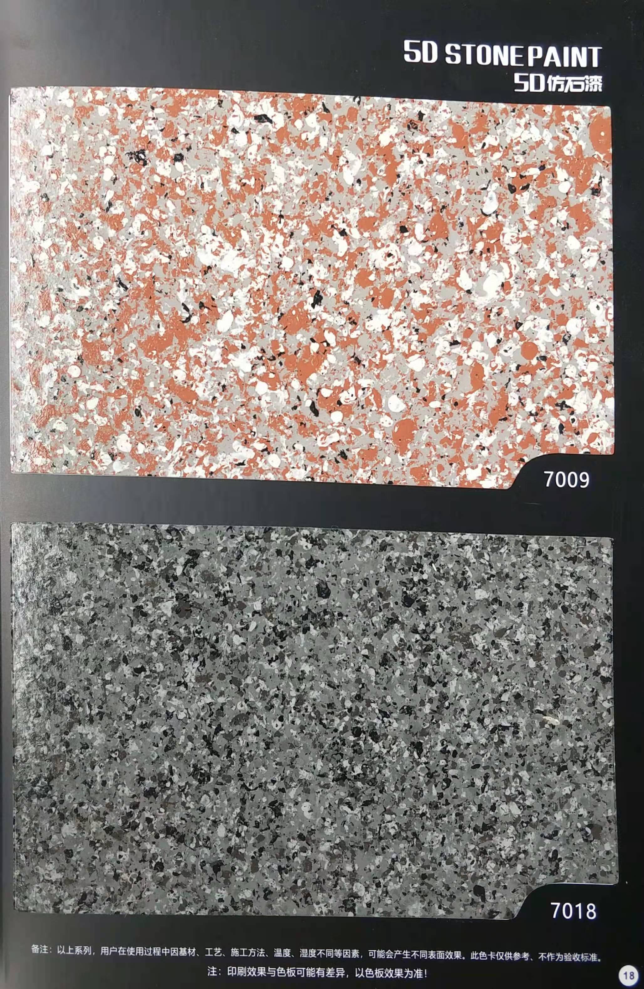 為方便市場(chǎng)客戶對(duì)5D仿石漆樣式的選擇,滿足消費(fèi)者對(duì)其產(chǎn)品效果的體現(xiàn),友情漆現(xiàn)在推出一套全方景立體式展現(xiàn),用不同色彩仿石漆組合裝飾出來(lái)的墻面效果圖冊(cè)。