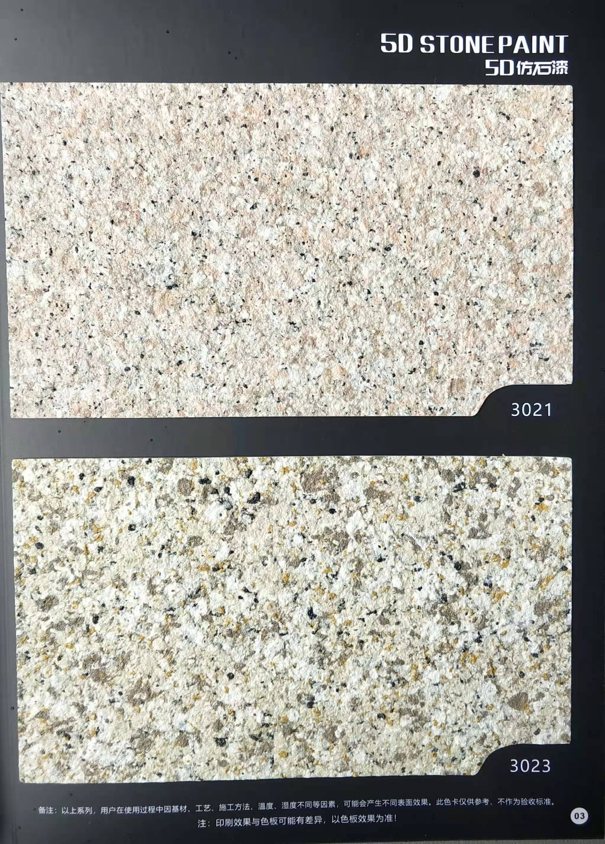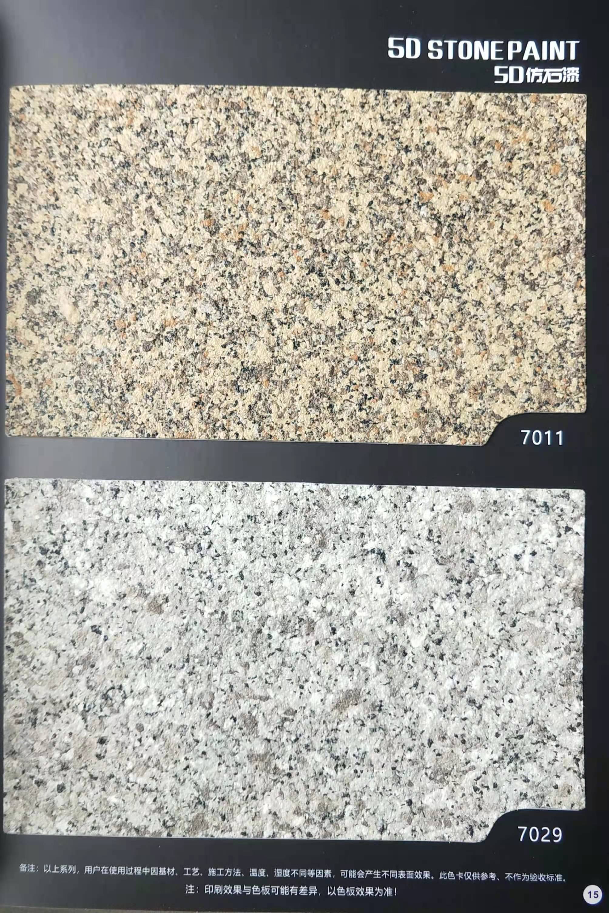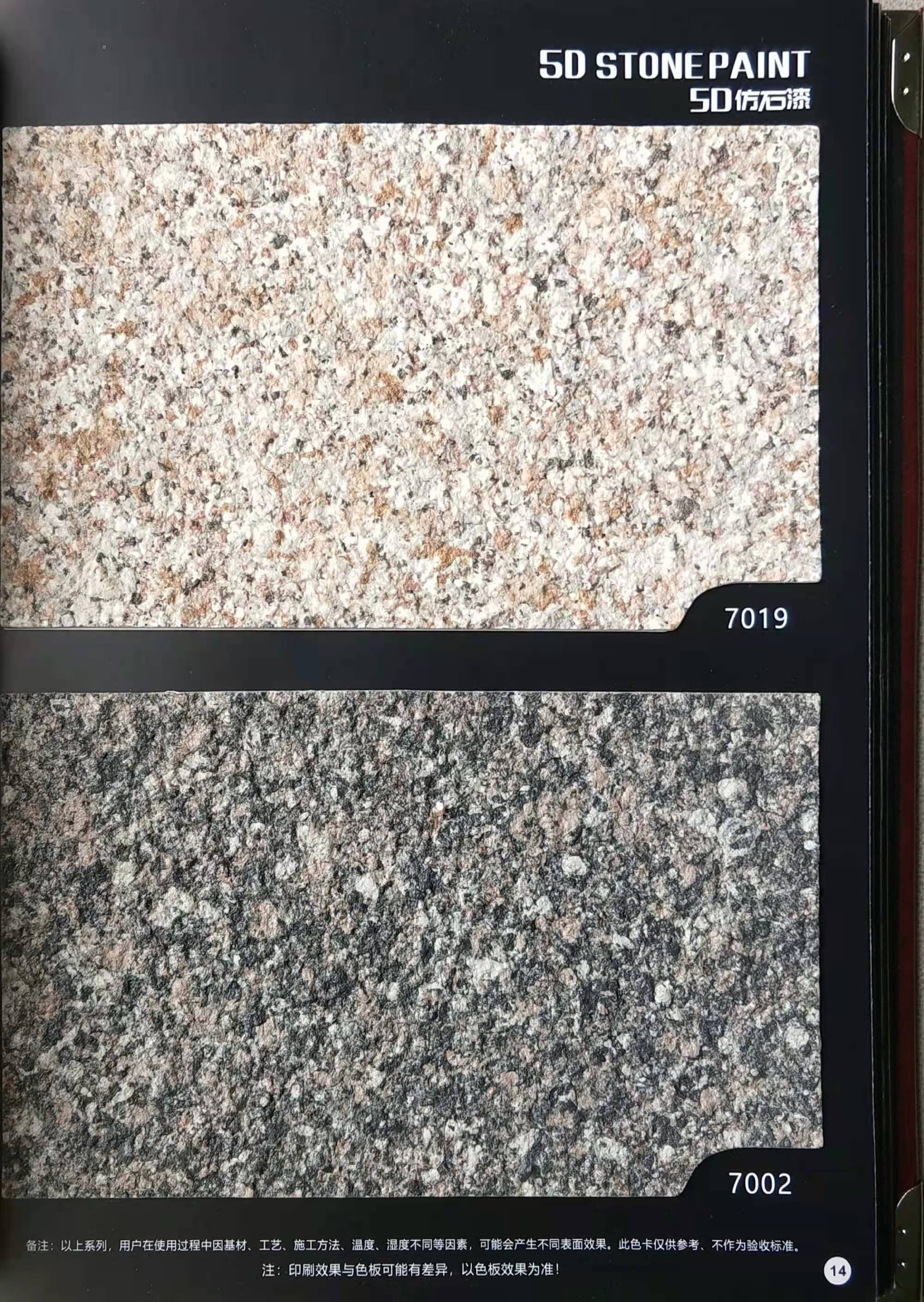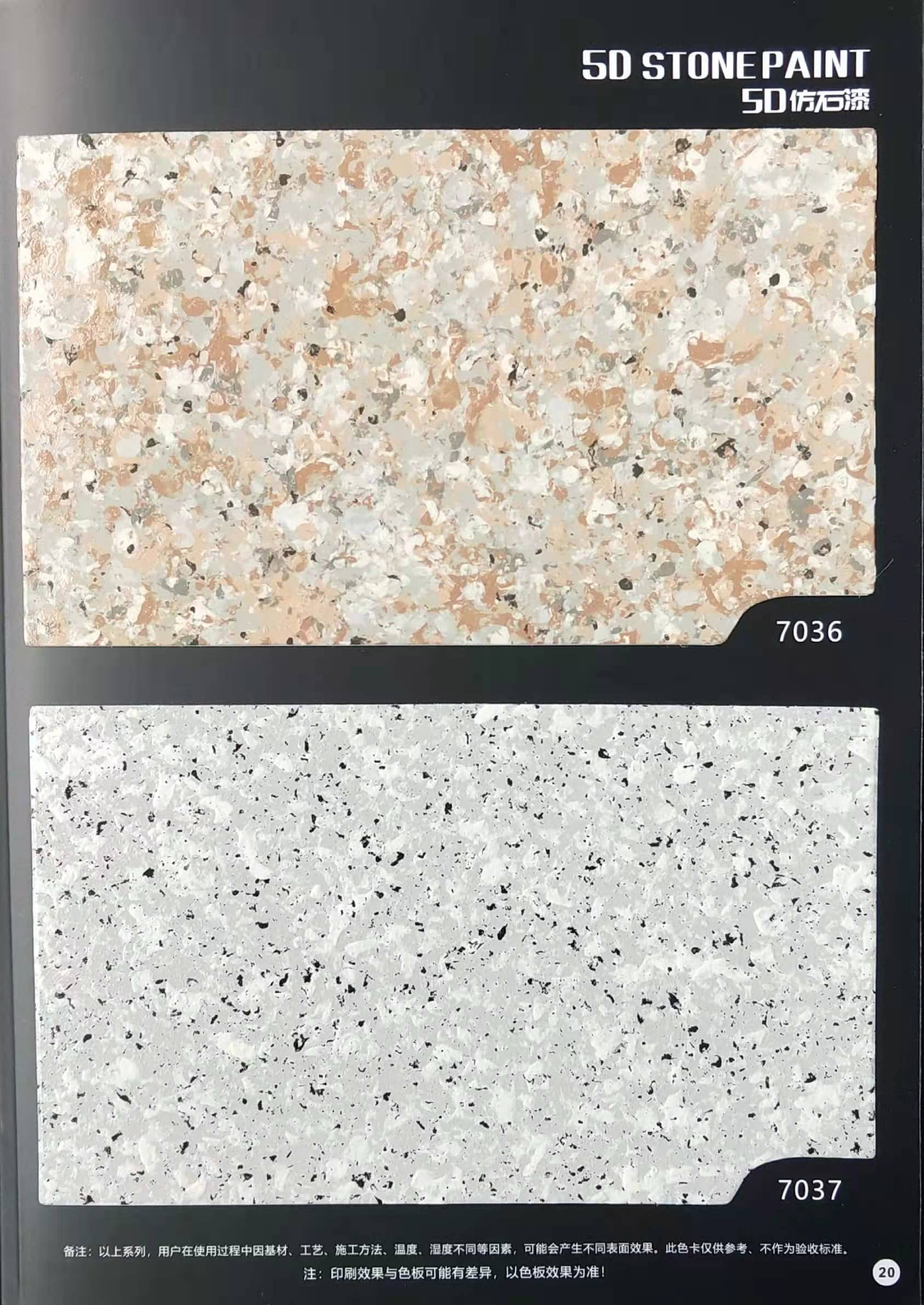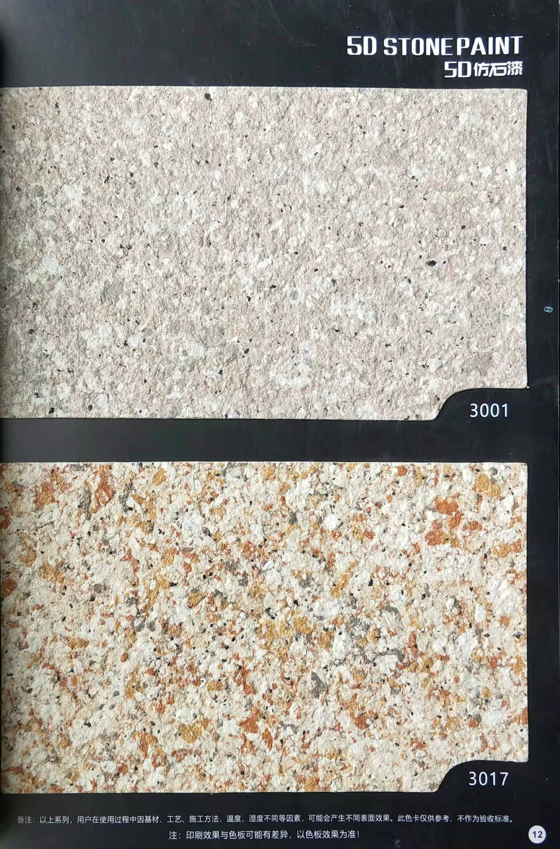 為方便市場(chǎng)客戶對(duì)5D仿石漆樣式的選擇,滿足消費(fèi)者對(duì)其產(chǎn)品效果的體現(xiàn),友情漆現(xiàn)在推出一套全方景立體式展現(xiàn),用不同色彩仿石漆組合裝飾出來(lái)的墻面效果圖冊(cè)。