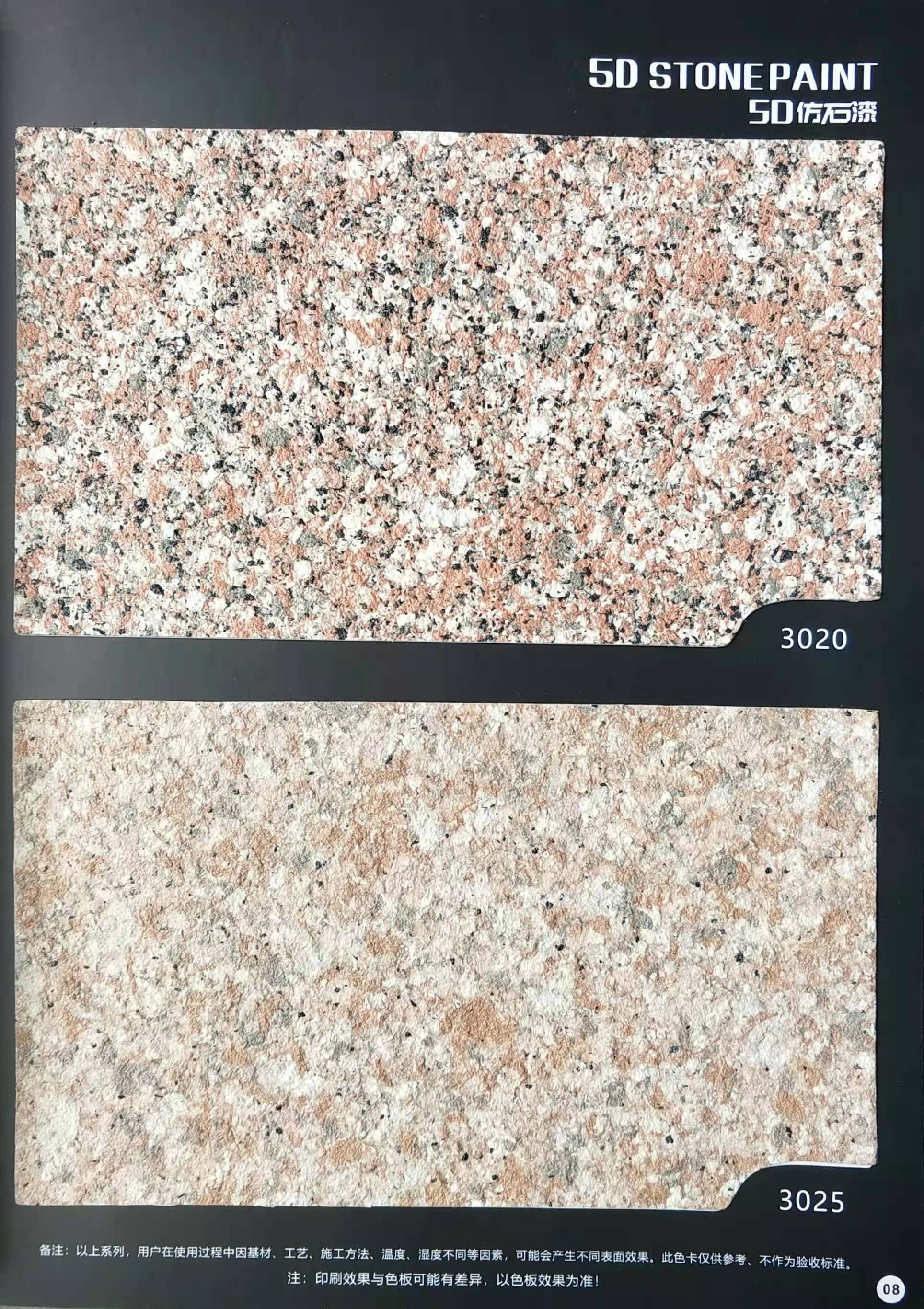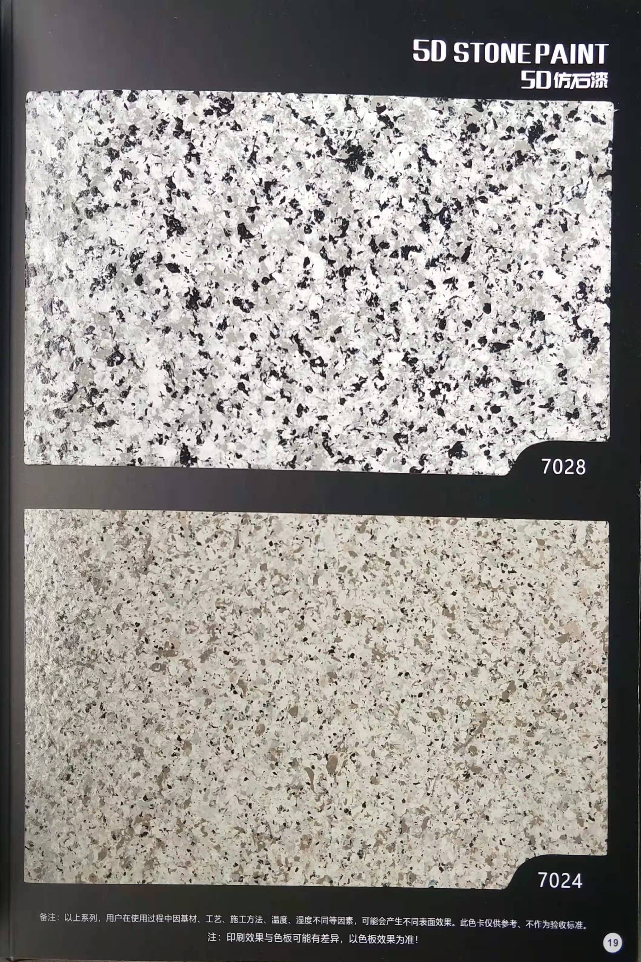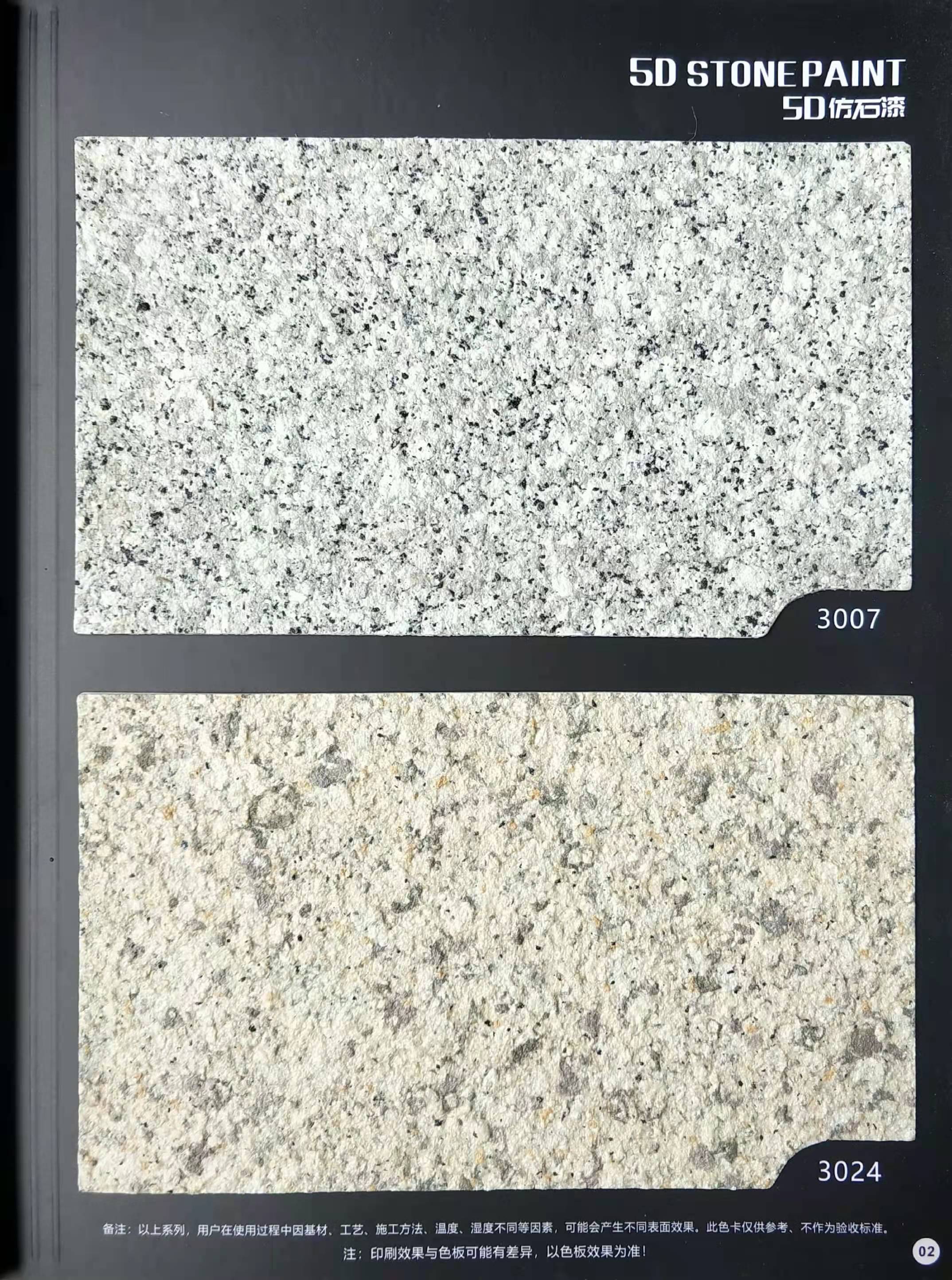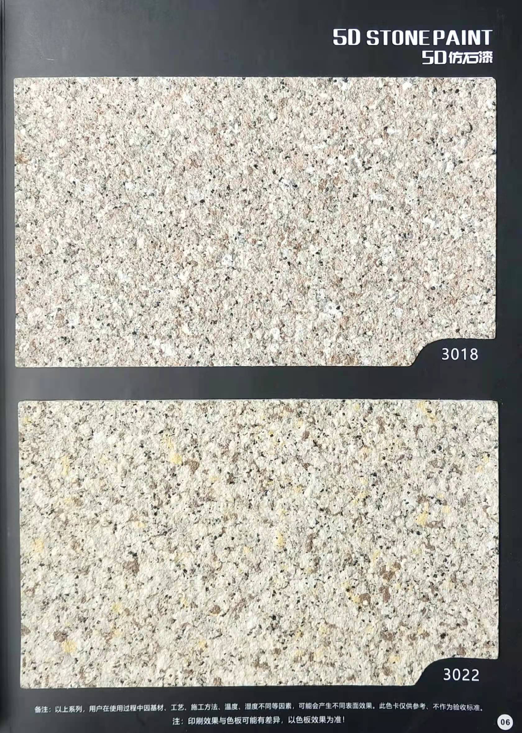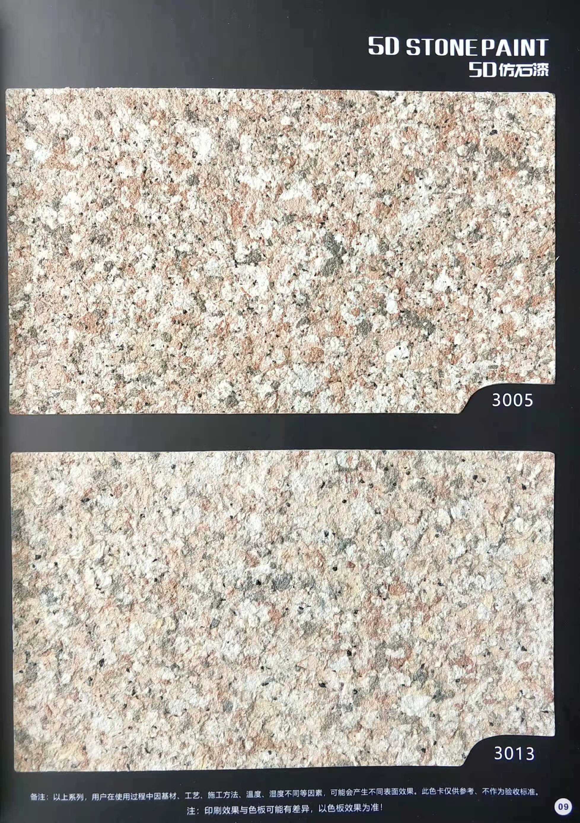 為方便市場(chǎng)客戶對(duì)5D仿石漆樣式的選擇,滿足消費(fèi)者對(duì)其產(chǎn)品效果的體現(xiàn),友情漆現(xiàn)在推出一套全方景立體式展現(xiàn),用不同色彩仿石漆組合裝飾出來(lái)的墻面效果圖冊(cè)。