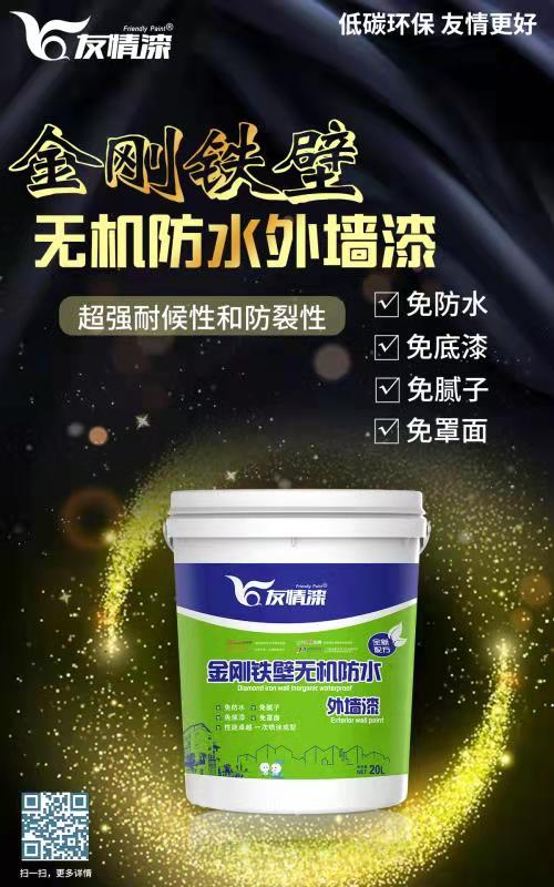 友情金剛鐵壁無機防水外墻漆,具有防水抗堿,耐候性好,施工極其簡單,省時又省工的優點,更可以避免外墻發黑發霉,墻面起泡起皮等墻體問題,成為當今外墻翻新用漆的爆款。