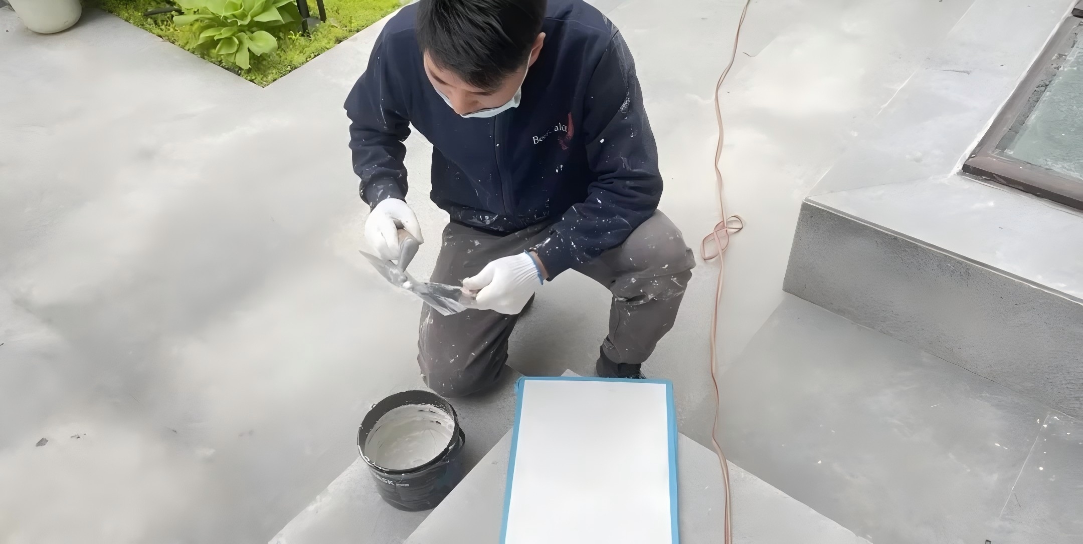 1. 將漿料按照一定的比例調制好,用專門的藝術涂料批刀,進行交叉式第一道的批刮,力度均勻保持圖。