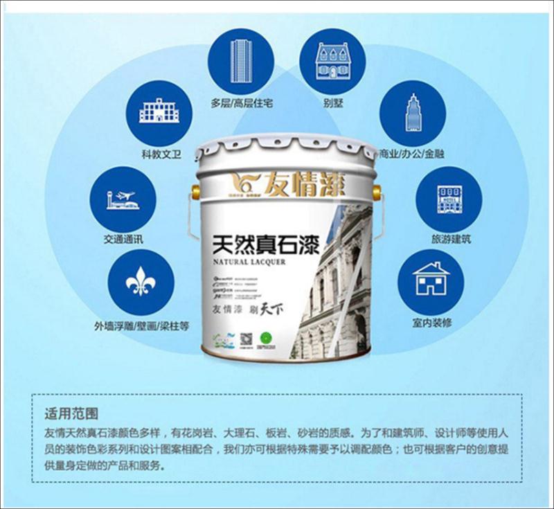 真石漆是一種裝飾效果酷似大理石、花崗巖的涂料。主要采用各種顏色的天然石粉配制而成,應(yīng)用于建筑外墻的仿石材效果,因此又稱液態(tài)石。真石漆裝修后的建筑物,具有天然真實(shí)的自然色澤,給人以高雅、和諧、莊重之美感,適合于各類建筑物的室內(nèi)外裝修。